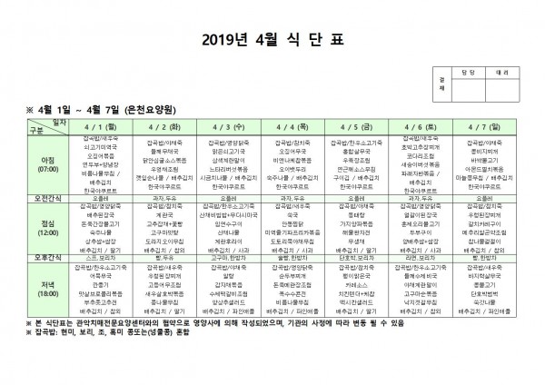 4월 첫째주 식단표 페이지 정보 작성자 은천노인복지회 작성일19-04-08 11:56 조회201,051회 댓글0건 관련링크 이전글 다음글 목록 답변 본문 4월 첫째주 식단표 이전글 다음글 목록 답변