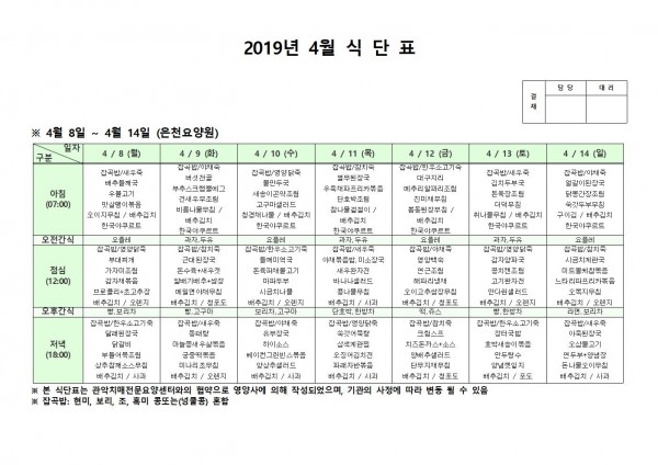 4월 둘째주 식단표 페이지 정보 작성자 은천노인복지회 작성일19-04-16 09:48 조회200,813회 댓글0건 관련링크 이전글 다음글 목록 답변 본문 4월 둘째주 식단표 이전글 다음글 목록 답변