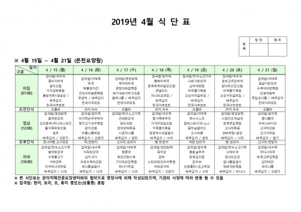 4월 셋째주 식단표 페이지 정보 작성자 은천노인복지회 작성일19-04-22 13:22 조회200,804회 댓글0건 관련링크 이전글 다음글 목록 답변 본문 4월 셋째주 식단표 이전글 다음글 목록 답변