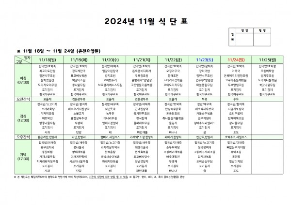 11월 셋째주 식단표 페이지 정보 작성자 은천노인복지회 작성일24-11-15 09:26 조회16,461회 댓글0건 관련링크 이전글 다음글 목록 답변 본문 . 이전글 다음글 목록 답변
