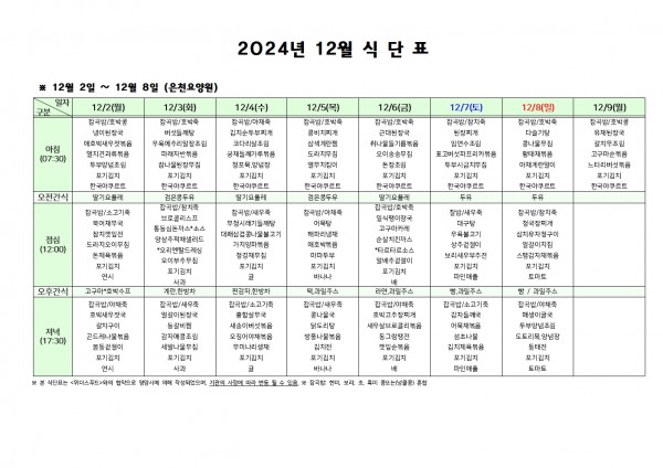 12월 첫째주 식단표 페이지 정보 작성자 은천노인복지회 작성일24-11-29 16:53 조회15,860회 댓글0건 관련링크 이전글 다음글 목록 답변 본문 . 이전글 다음글 목록 답변