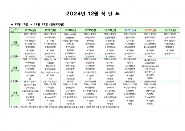 12월 셋째주 식단표 페이지 정보 작성자 은천노인복지회 작성일24-12-13 09:36 조회15,059회 댓글0건 관련링크 이전글 다음글 목록 답변 본문 . 이전글 다음글 목록 답변