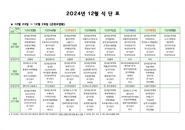 12월 넷째주 식단표 페이지 정보 작성자 은천노인복지회 작성일24-12-23 16:39 조회14,360회 댓글0건 관련링크 이전글 다음글 목록 답변 본문 . 이전글 다음글 목록 답변