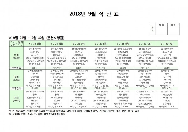 9월 넷째주 식단표 페이지 정보 작성자 은천노인복지회 작성일18-10-08 11:06 조회201,313회 댓글0건 관련링크 이전글 다음글 목록 답변 본문 9월 넷째주 식단표 이전글 다음글 목록 답변