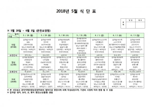 5월 다섯째주 식단표 페이지 정보 작성자 은천노인복지회 작성일18-06-07 10:39 조회202,486회 댓글0건 관련링크 이전글 다음글 목록 답변 본문 5월 다섯쨰주 식단표 이전글 다음글 목록 답변