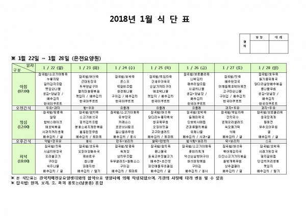 1월 넷째주 식단표 페이지 정보 작성자 은천노인복지회 작성일18-01-24 11:07 조회191,224회 댓글0건 관련링크 이전글 다음글 목록 답변 본문 1월 넷째주 식단표 이전글 다음글 목록 답변