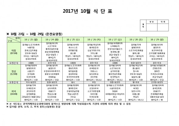 10월 넷째주 식단표 페이지 정보 작성자 은천노인복지회 작성일17-10-23 11:19 조회181,788회 댓글0건 관련링크 이전글 다음글 목록 답변 본문 10월 넷째주 식단표 이전글 다음글 목록 답변
