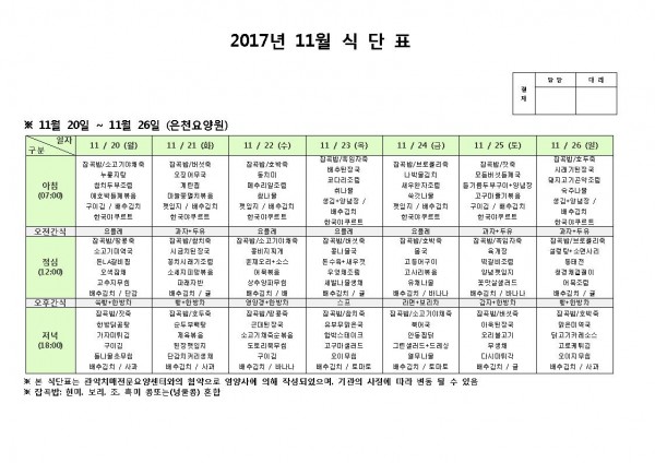 11월 넷째주 식단표 페이지 정보 작성자 은천노인복지회 작성일17-11-20 11:22 조회183,753회 댓글0건 관련링크 이전글 다음글 목록 답변 본문 11월 넷째주 식단표 이전글 다음글 목록 답변
