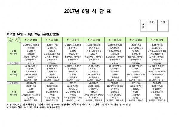 8월 셋째주 식단표 페이지 정보 작성자 은천노인복지회 작성일17-08-14 14:05 조회177,125회 댓글0건 관련링크 이전글 다음글 목록 답변 본문 8월 셋째주 식단표 이전글 다음글 목록 답변