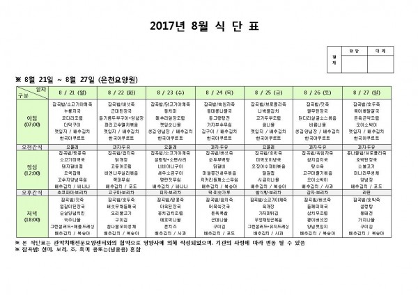 8월 넷째주 식단표 페이지 정보 작성자 은천노인복지회 작성일17-08-21 10:51 조회177,338회 댓글0건 관련링크 이전글 다음글 목록 답변 본문 8월 넷째주 식단표 이전글 다음글 목록 답변
