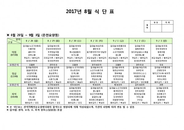 8월 다섯째주식단표 페이지 정보 작성자 은천노인복지회 작성일17-08-28 14:38 조회178,712회 댓글0건 관련링크 이전글 다음글 목록 답변 본문 8월 다섯째주식단표 이전글 다음글 목록 답변