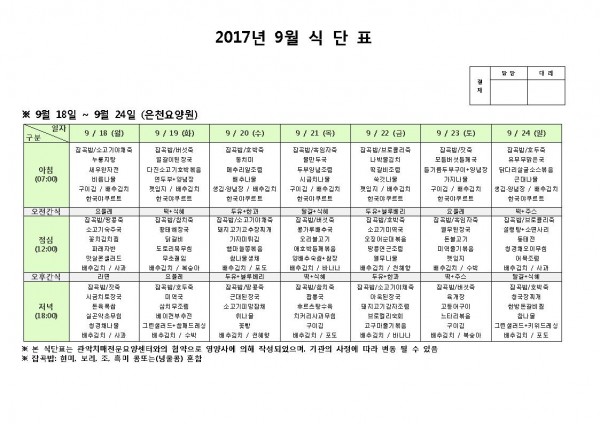 9월 셋째주 식단표 페이지 정보 작성자 은천노인복지회 작성일17-09-18 11:02 조회180,187회 댓글0건 관련링크 이전글 다음글 목록 답변 본문 9월 셋째주 식단표 이전글 다음글 목록 답변