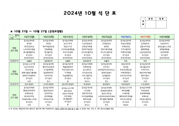 10월 넷째주 식단표 페이지 정보 작성자 은천노인복지회 작성일24-10-18 10:37 조회16,846회 댓글0건 관련링크 이전글 다음글 목록 답변 본문 . 이전글 다음글 목록 답변