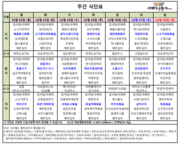 2월 첫째주 식단표 페이지 정보 작성자 은천노인복지회 작성일26-02-04 11:48 조회14회 댓글0건 관련링크 다음글 목록 답변 본문 2월 첫째주 어르신 식단표 안내해 드립니다. 정성과 영양을 담아 준비하겠습니다. 다음글 목록 답변