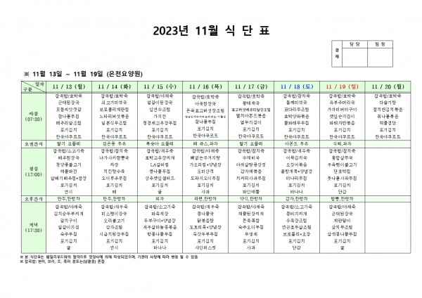 11월 셋째주 식단표 페이지 정보 작성자 은천노인복지회 작성일23-11-10 13:17 조회33,729회 댓글0건 관련링크 이전글 다음글 목록 답변 본문 . 이전글 다음글 목록 답변