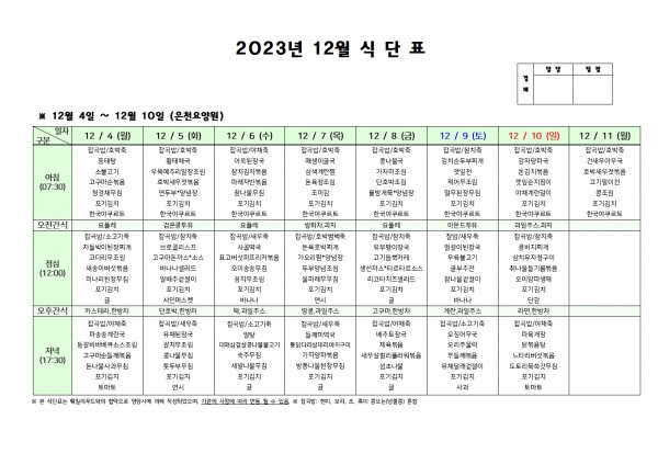 12월 둘째주 식단표 페이지 정보 작성자 은천노인복지회 작성일23-12-01 16:35 조회30,058회 댓글0건 관련링크 이전글 다음글 목록 답변 본문 . 이전글 다음글 목록 답변