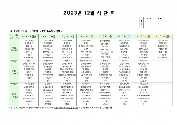 12월 넷째주 식단표 페이지 정보 작성자 은천노인복지회 작성일23-12-15 11:21 조회31,833회 댓글0건 관련링크 이전글 다음글 목록 답변 본문 . 이전글 다음글 목록 답변