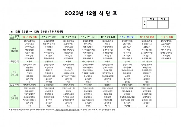 12월 다섯째주 식단표 페이지 정보 작성자 은천노인복지회 작성일23-12-22 15:50 조회30,809회 댓글0건 관련링크 이전글 다음글 목록 답변 본문 . 이전글 다음글 목록 답변