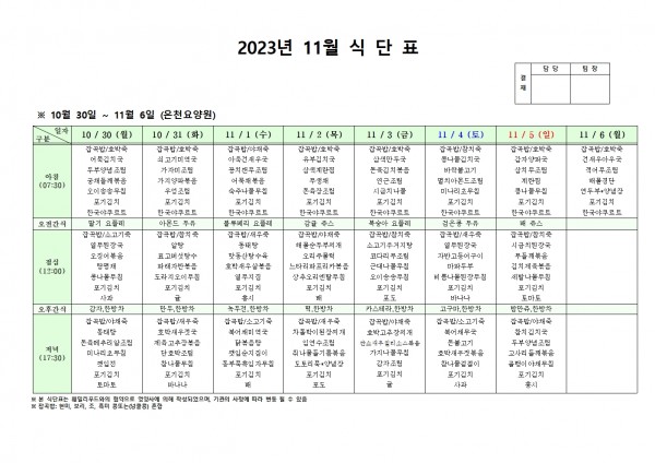 11월 첫째주 식단표 페이지 정보 작성자 은천노인복지회 작성일23-10-26 13:39 조회33,755회 댓글0건 관련링크 이전글 다음글 목록 답변 본문 . 이전글 다음글 목록 답변