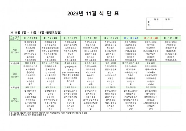 11월 둘째주 식단표 페이지 정보 작성자 은천노인복지회 작성일23-11-02 17:19 조회33,978회 댓글0건 관련링크 이전글 다음글 목록 답변 본문 . 이전글 다음글 목록 답변