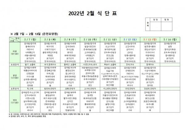 2월 둘째주 식단표 페이지 정보 작성자 은천노인복지회 작성일22-02-04 18:58 조회114,680회 댓글0건 관련링크 이전글 다음글 목록 답변 본문 . 이전글 다음글 목록 답변