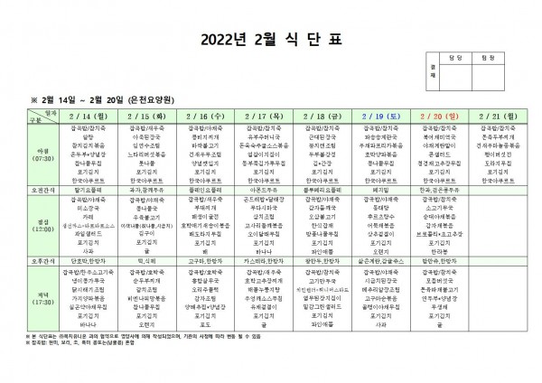 2월 셋째주 식단표 페이지 정보 작성자 은천노인복지회 작성일22-02-10 16:28 조회114,504회 댓글0건 관련링크 이전글 다음글 목록 답변 본문 . 이전글 다음글 목록 답변
