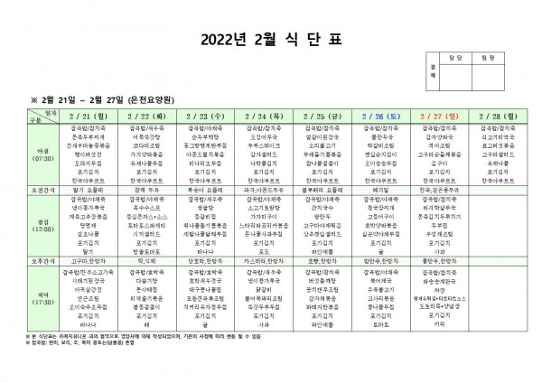 2월 넷째주 식단표 페이지 정보 작성자 은천노인복지회 작성일22-02-25 09:21 조회112,923회 댓글0건 관련링크 이전글 다음글 목록 답변 본문 . 이전글 다음글 목록 답변