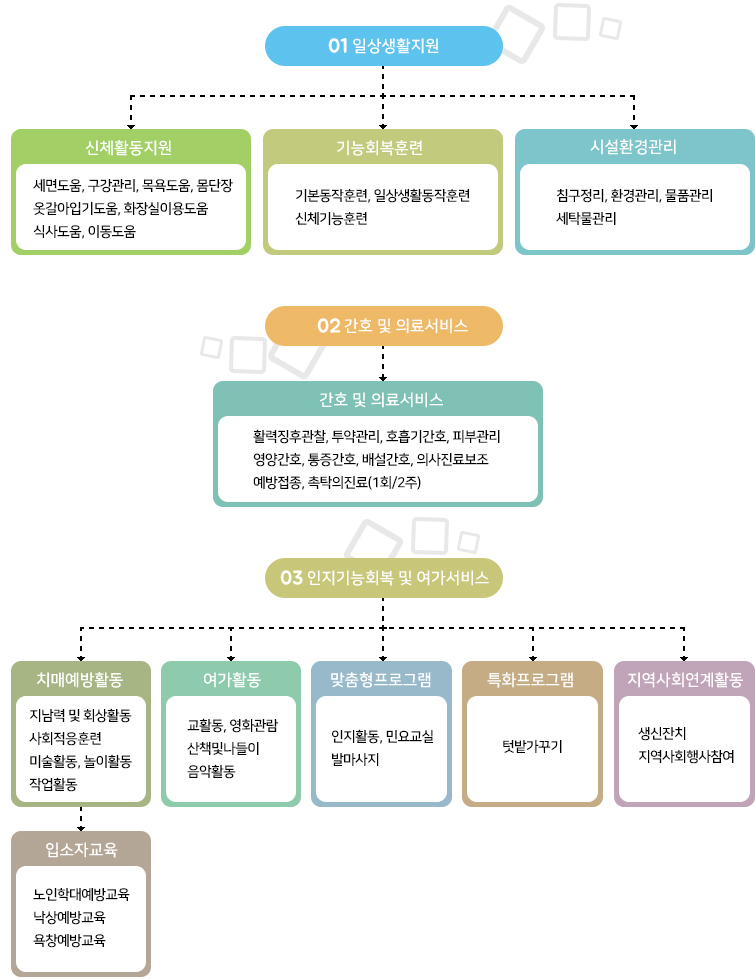 • 입소대상자의 삶의 질을 높이기 위한 최적의 요양서비스를 제공하기 위하여 개인적 특성을 고려한 체계적인 관리를 하고,