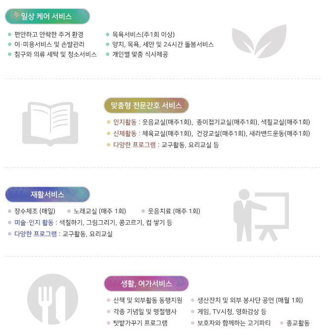 - 입소대상자의 삶의 질을 높이기 위한 최적의 요양서비스를 제공하기 위하여 개인적 특성을 고려한 체계적인 관리를 하고,